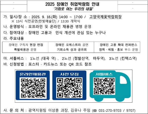 동행정복지센터공지 공지사항 안내 게시판에 게시된 고양시 사진은 “공공누리 3유형 (출처표시+상업적 이용가능+변경금지)” 조건에 따라 이용할 수 있습니다. 2025 경기도 장애인 취업박람회 안내 효자동 | 2025.09.10 13:18:36 | 조회수: 45 붙임1. ☆★2025 장애인 취업박람회 최종 메인포스터.jpg(1 MB) 미리보기 붙임2. 2025 장애인 취업박람회 참여자 안내 1부..pdf(853 KB) 미리보기 고양시청이(가) 창작한 [ 동행정복지센터공지 ] 저작물은 공공누리 "출처표시+변경금지" 조건에 따라 이용할 수 있습니다. 목록 이전글 구리「중흥S-클래스 힐더포레」장애인 특별공급 안내(수정) 다음글 「남양주 진접2 A-7블록」 장애인 특별공급 안내