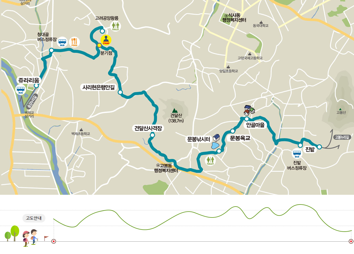 진밭 ▶ 문봉낚시터 ▶ 사리현은행안길 ▶ 고려공왕왕릉 ▶ 쥬쥬테마동물원