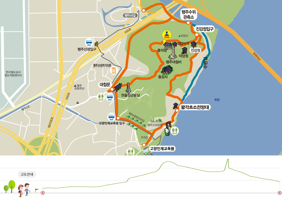 대첩문에서 출발해 충장사, 충의정, 대첩비, 진강정, 팔각초소전망대, 고양인재교육원(구 시정연구원)을 거쳐 다시 대첩문으로 돌아오는 순환코스이다.