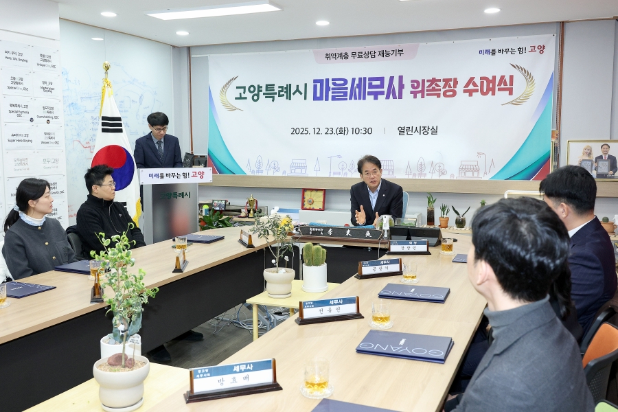 시정현장(사진) 시정현장(사진) 안내 게시판에 게시된 고양시 사진은 “공공누리 3유형 (출처표시+상업적 이용 가능+변경금지)” 조건에 따라 이용할 수 있습니다. 고양특례시 마을세무사 위촉장 수여식 2025.12.23 13:33:24 파일 다운로드 파일 다운로드 파일 다운로드 파일 다운로드 고양특례시 마을세무사 위촉장 수여식 장소 : 고양시청 열린시장실 날짜 : 2025년 12월 23일(화) 고양특례시 마을세무사 위촉장 수여식 장소 : 고양시청 열린시장실 날짜 : 2025년 12월 23일(화) 고양시청이(가) 창작한 [ 시정현장(사진) ] 저작물은 공공누리 "출처표시+변경금지" 조건에 따라 이용할 수 있습니다. 목록 이전글 2025 고양콘 인사이트 특별전 다음글 2025년 고양시 적극행정 우수사례 시상식 콘텐츠 관리부서 : 언론홍보담당관 언론보도팀 031-8075-2084