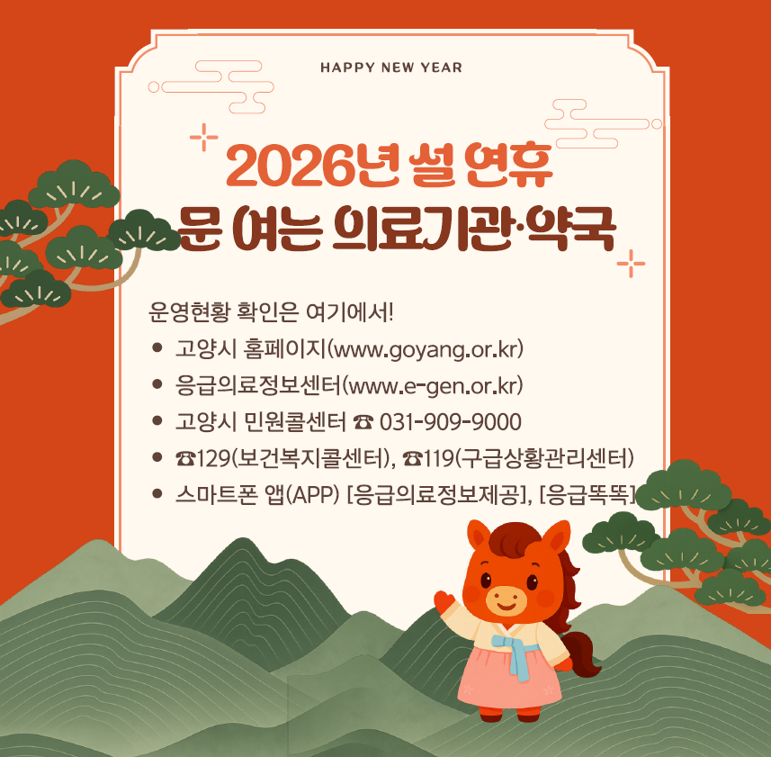 새소식 새소식안내 고양시의 새소식을 가장 빠르고 정확하게 알려드립니다. 첨부파일 열람 시 홈페이지 하단의 뷰어다운로드 기능을 활용하실 수 있습니다. 2026년 고양시 설 연휴 문 여는 의료기관 및 약국 안내 보건행정과 | 2026.02.02 11:47:26 | 조회수: 133 전화번호 : 031-909-9000 2026년 설연휴 문여는 의료기관 및 약국 현황(2.3.기준).xls(390 KB) 미리보기 진료가능 병의원안내는 응급의료포털(e-gen) 바로가기 소아 야간·휴일 진료기관 안내 (달빛어린이병원) 바로가기 ※ 연휴기간 고양시 보건소 진료실 미운영 - 기타문의(09:00~18:00): 덕양구보건소☎031-8075-4012, 일산동구보건소☎031-8075-4086, 일산서구보건소☎031-8075-4161) 목록