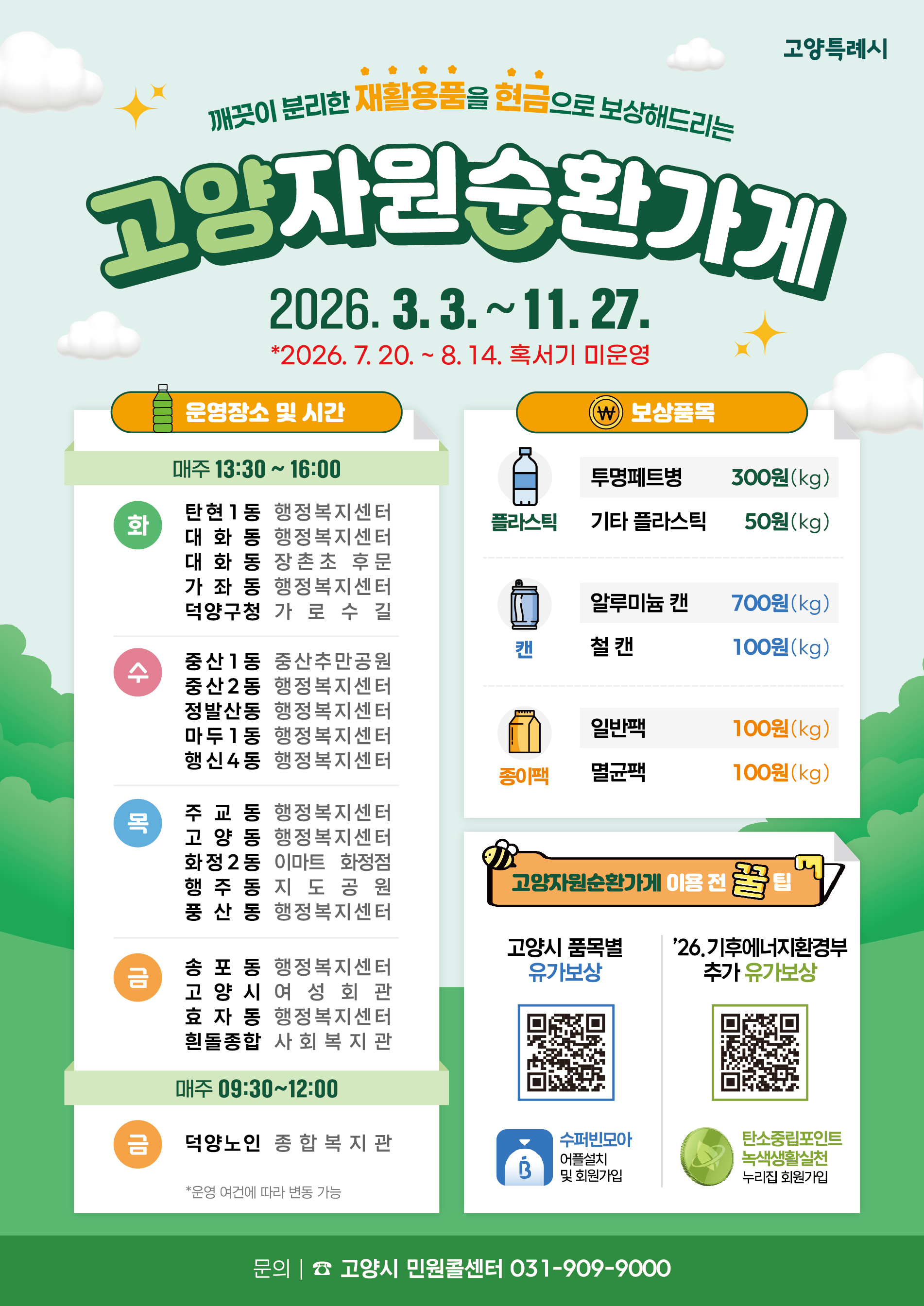 고양특례시는 시민들의 올바른 재활용품 분리배출 실천을 유도하고 자원순환 활성화를 위해 「2026년 고양 자원순환가게」를 운영합니다.